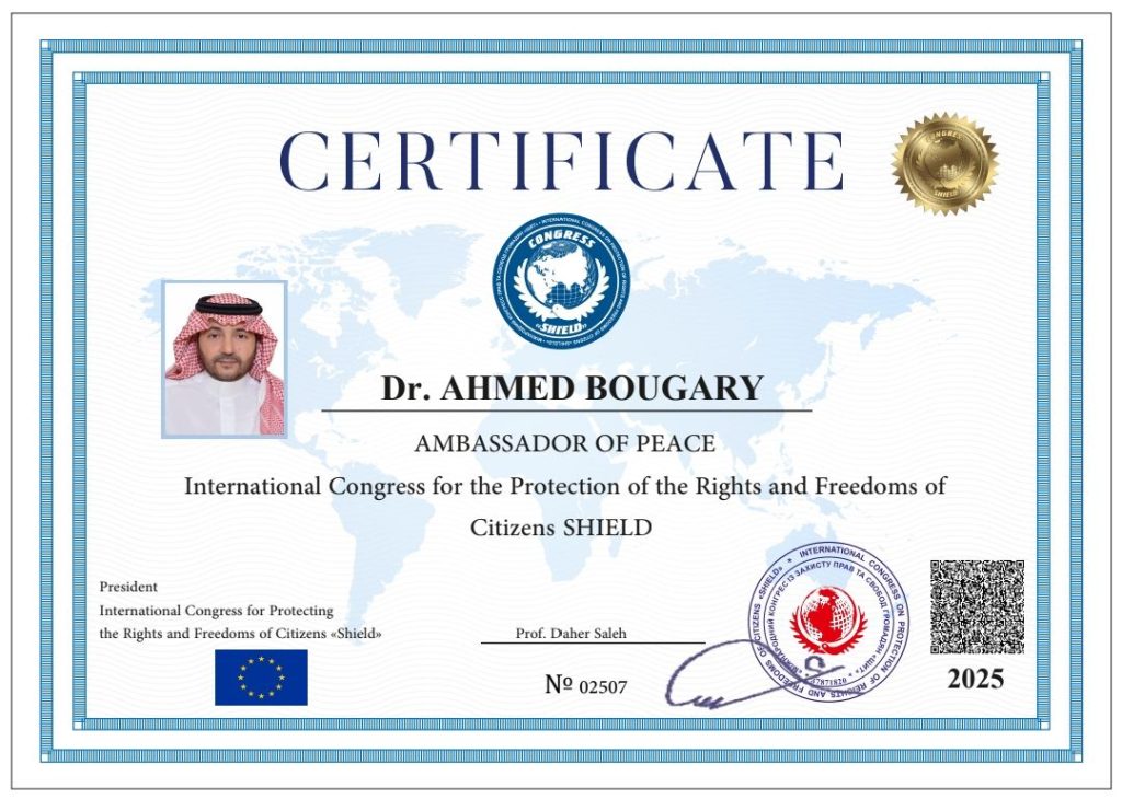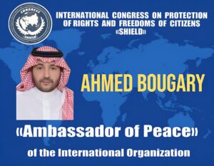 As part of its ongoing appreciation for outstanding humanitarian initiatives, the International Shield Organization has awarded Dr. Ahmed Bouqary the title of “Global Ambassador for Peace”, in recognition of his distinguished efforts and significant contributions in the field of humanitarian and volunteer work as well as his pivotal role in promoting a culture of peace, tolerance, and coexistence among nations, and advocating for human rights and freedoms.